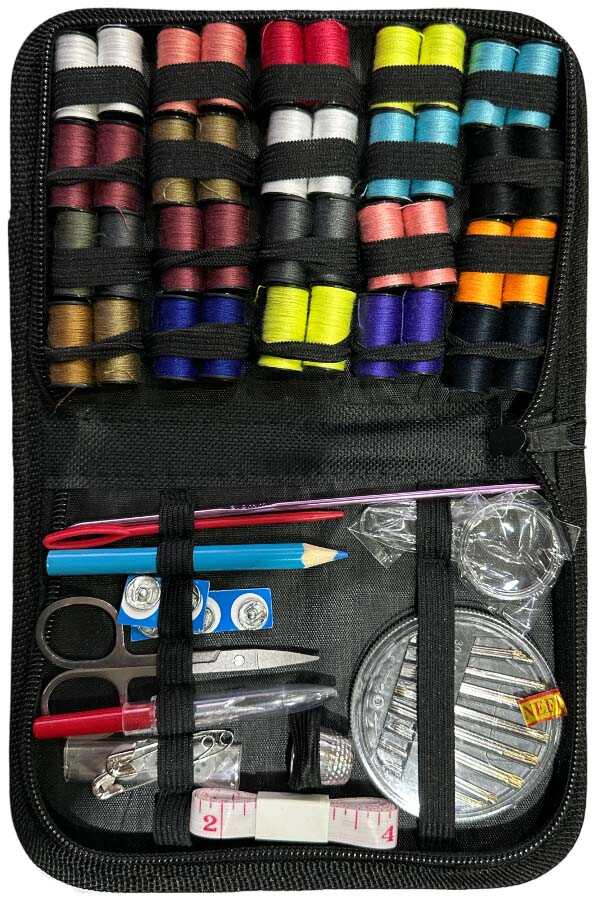 Dikiş seti; farklı renklerde ipler, iğneler, makas, mezura ve temel tamir aksesuarlarıyla pratik çözümler sunar. Kompakt ve fermuarlı çantası sayesinde evde, seyahatte her an elinizin altında.