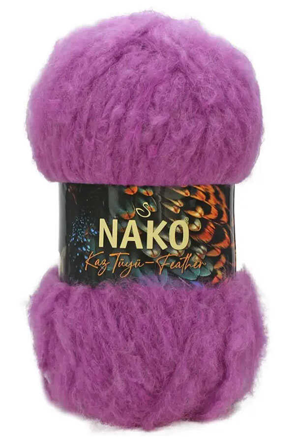 NAKO KAZTÜYÜ 200014 Menekşe, "Kaz Tüyü" (Feather) olarak bilinen, bir çekirdek iplik üzerine tutturulmuş yumuşak liflerden oluşan özel dokulu bir fantezi ipliktir. Örüldüğünde hacimli ve lüks bir görünüm sağlar. İpliğin teknik özellikleri, projelerinizi planlamanız için temel bilgileri içerir.
